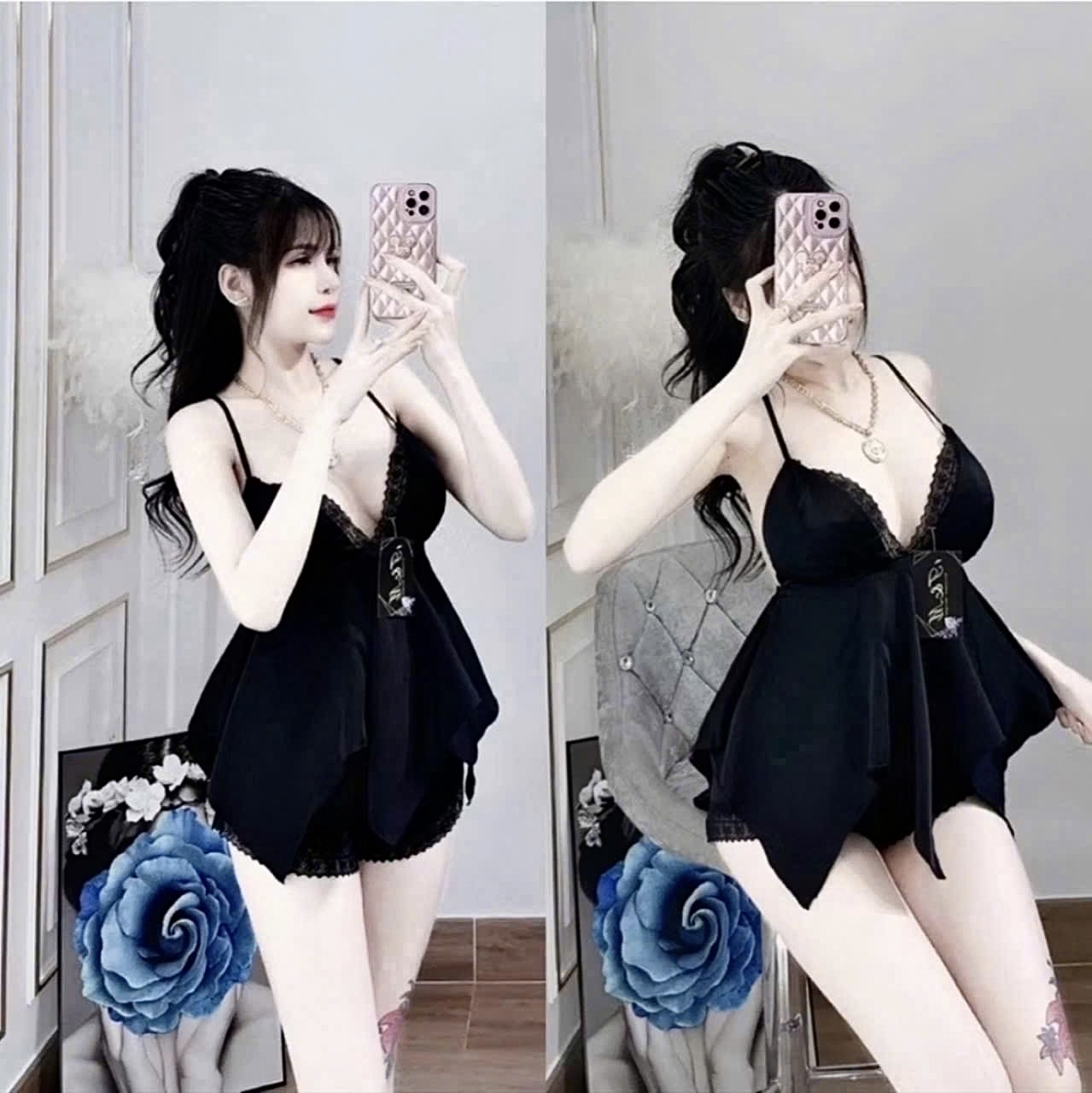 灰色針織吊帶背心/短褲套裝,搭配蕾絲邊