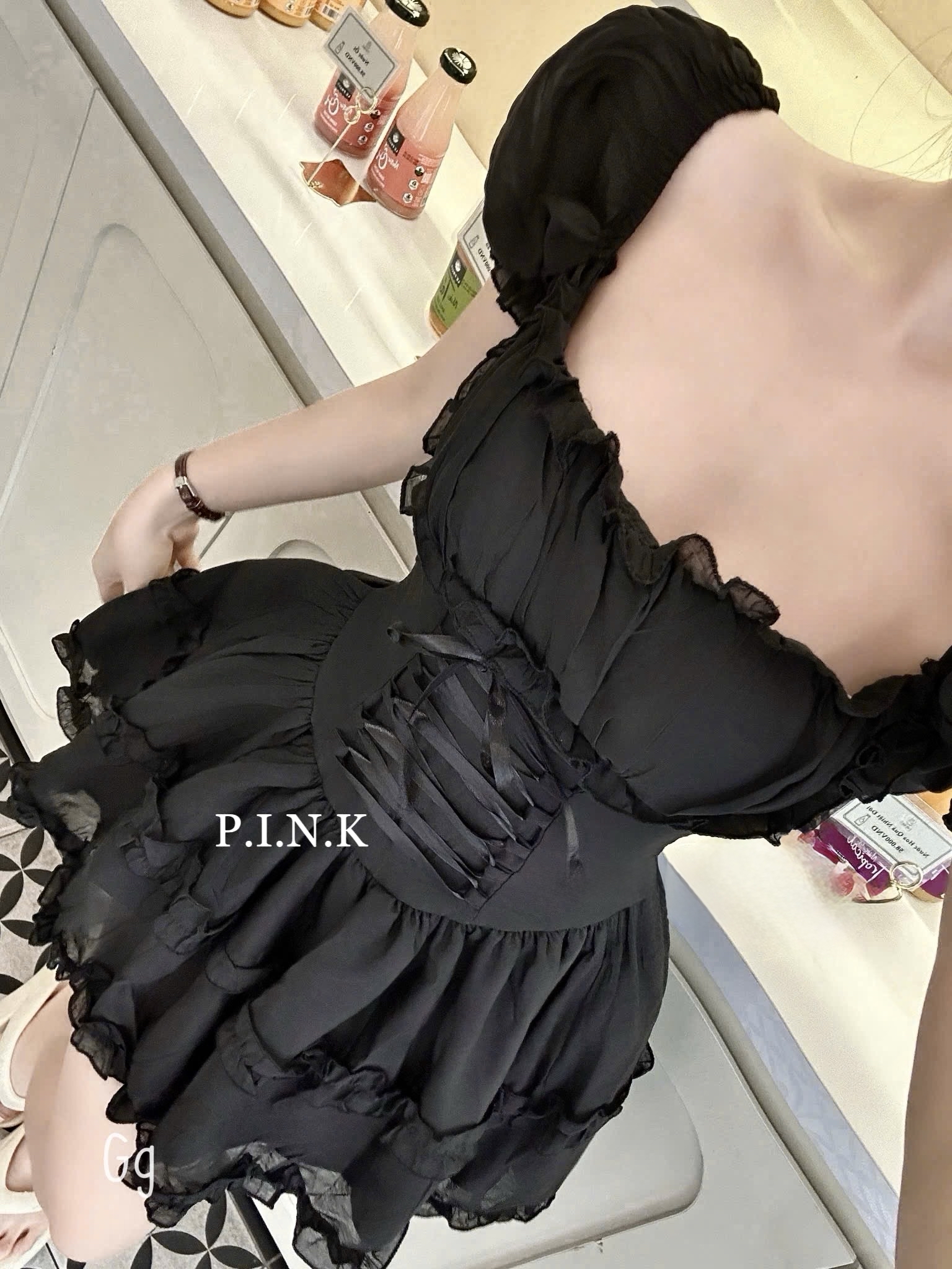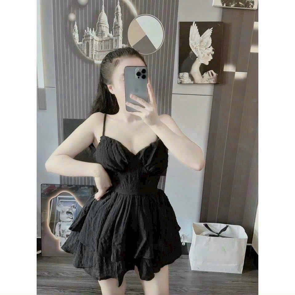 黑色細肩帶褶皺分層荷葉邊下擺連身裙