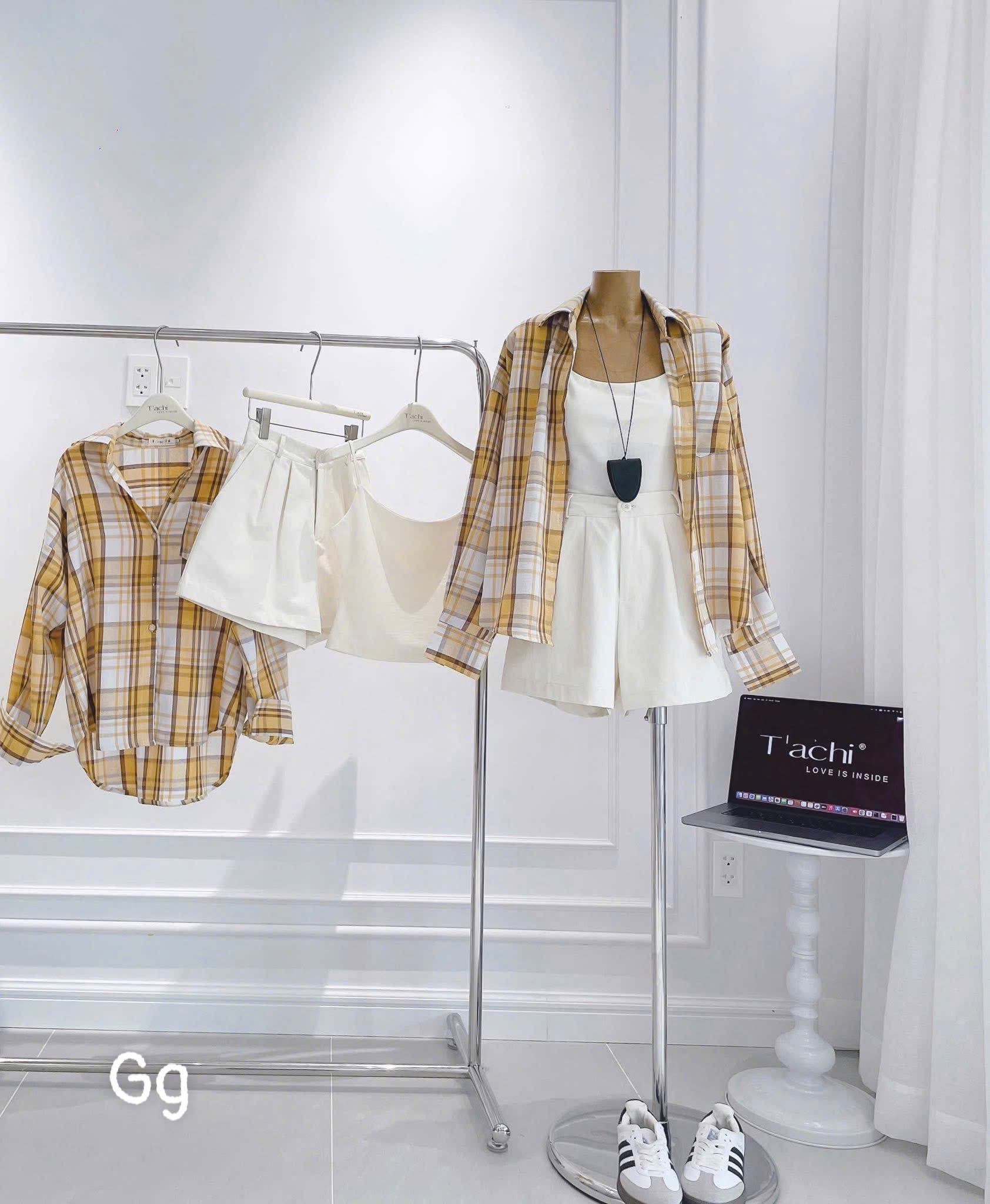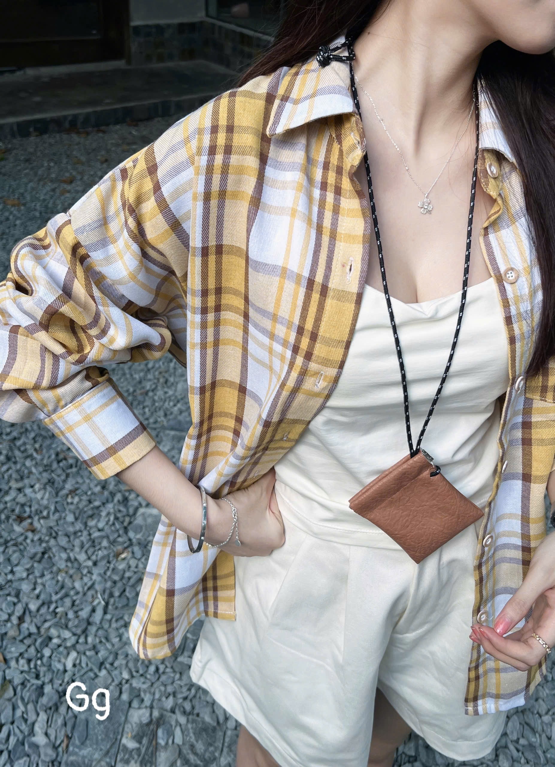 休閒格紋襯衫與短褲两件套