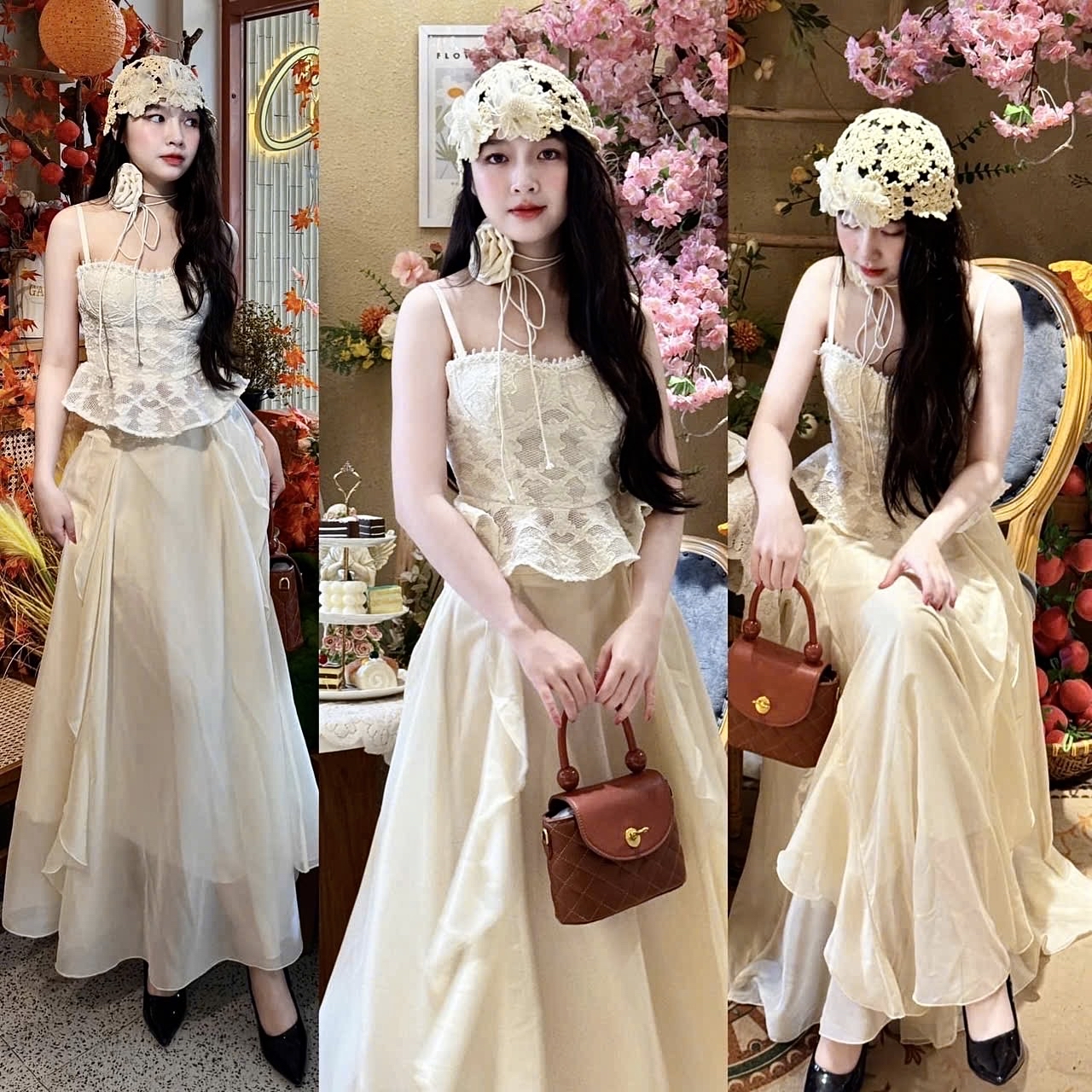 優雅白色蕾絲緊身胸衣搭配飄逸荷葉邊長裙两件套
