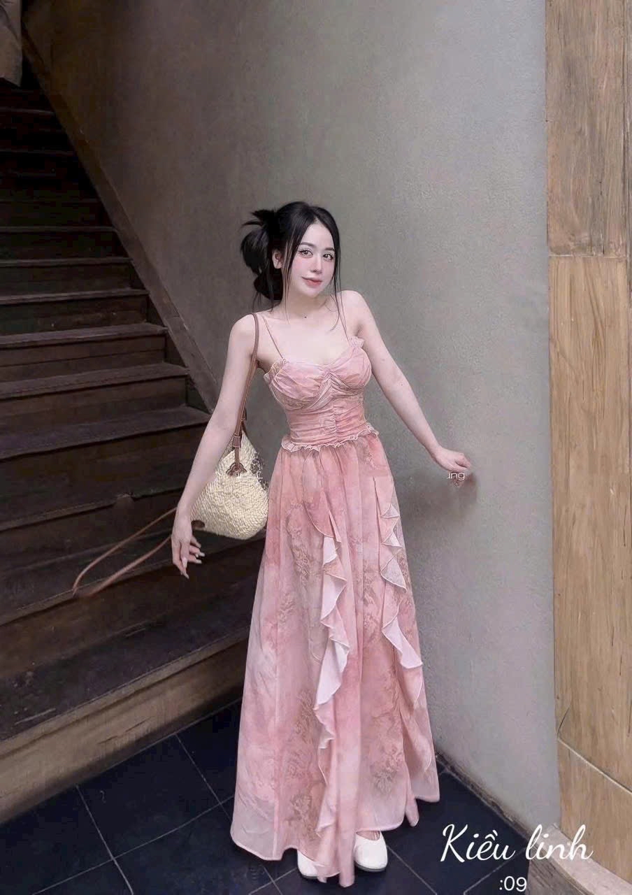 優雅細肩帶花卉印花荷葉邊長裙