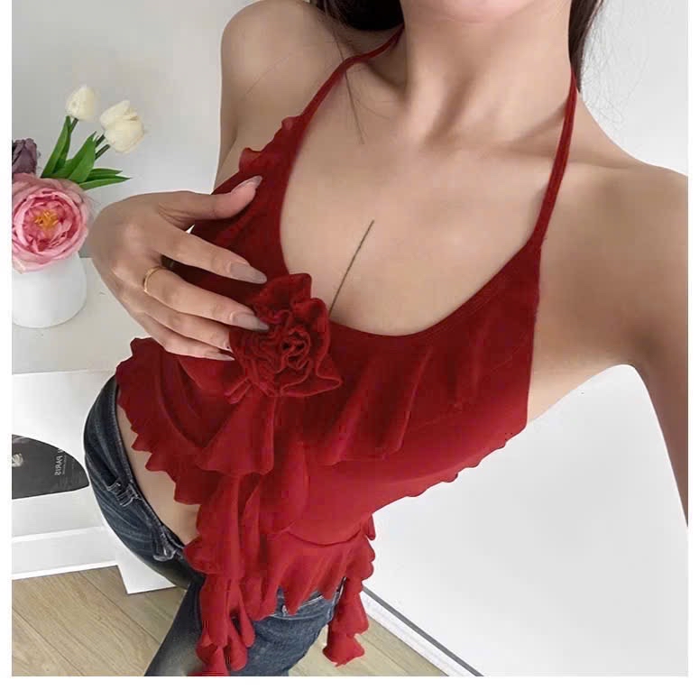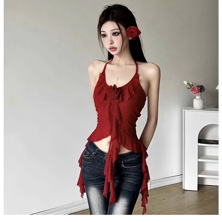 女式紅色荷葉邊花卉吊帶上衣