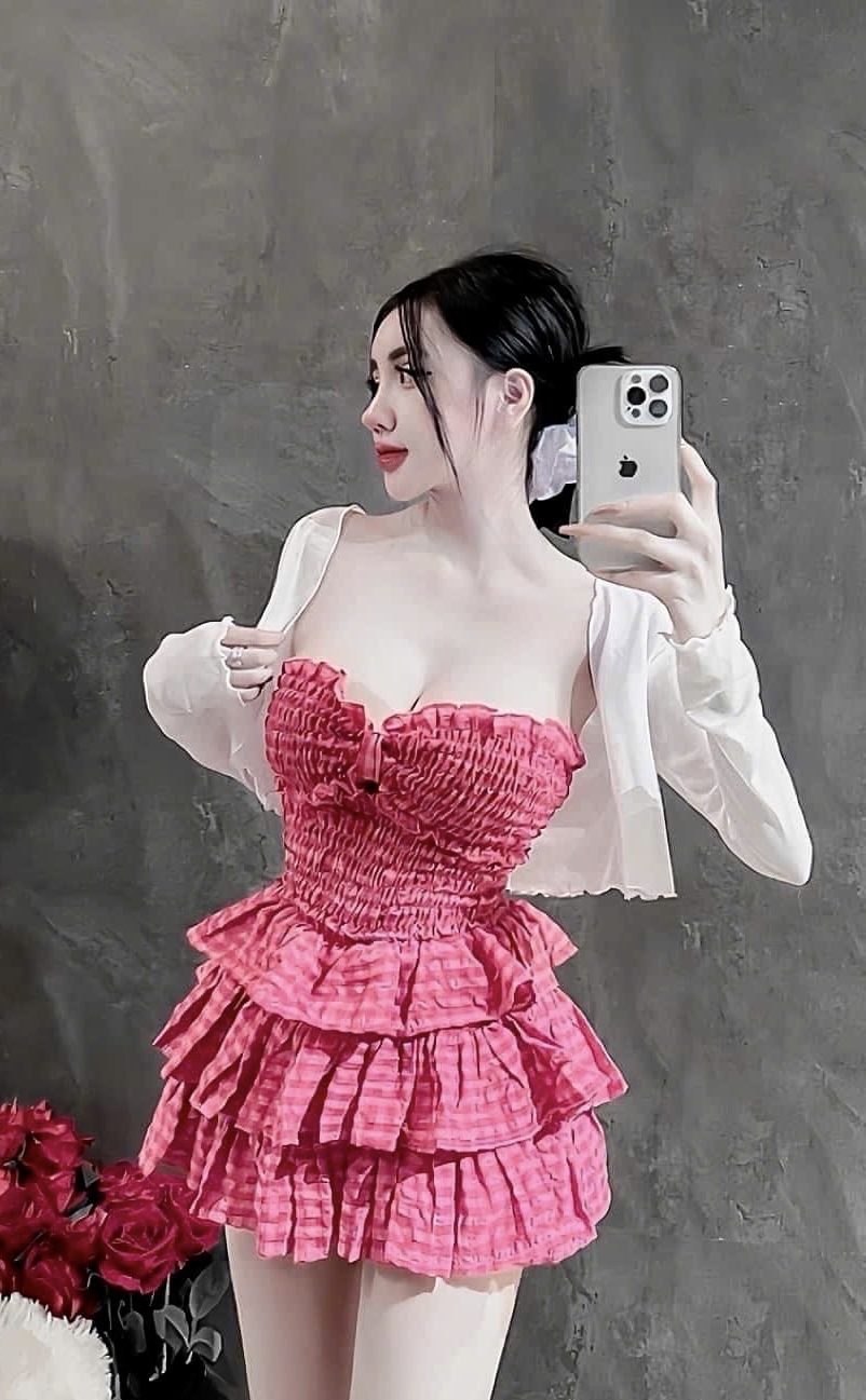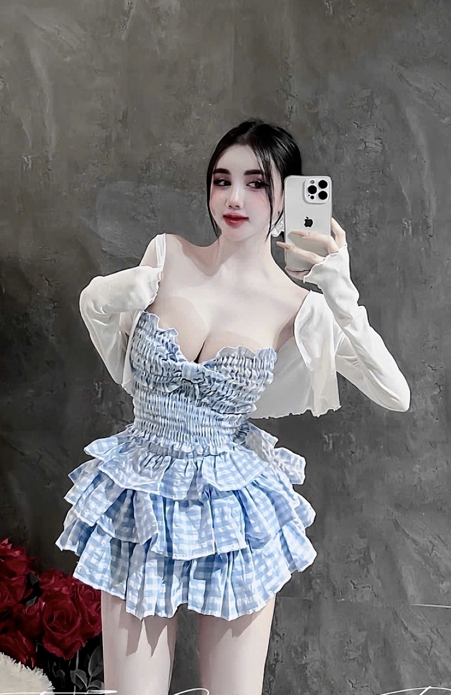 格子荷葉邊迷你洋裝搭配白色短版開襟衫