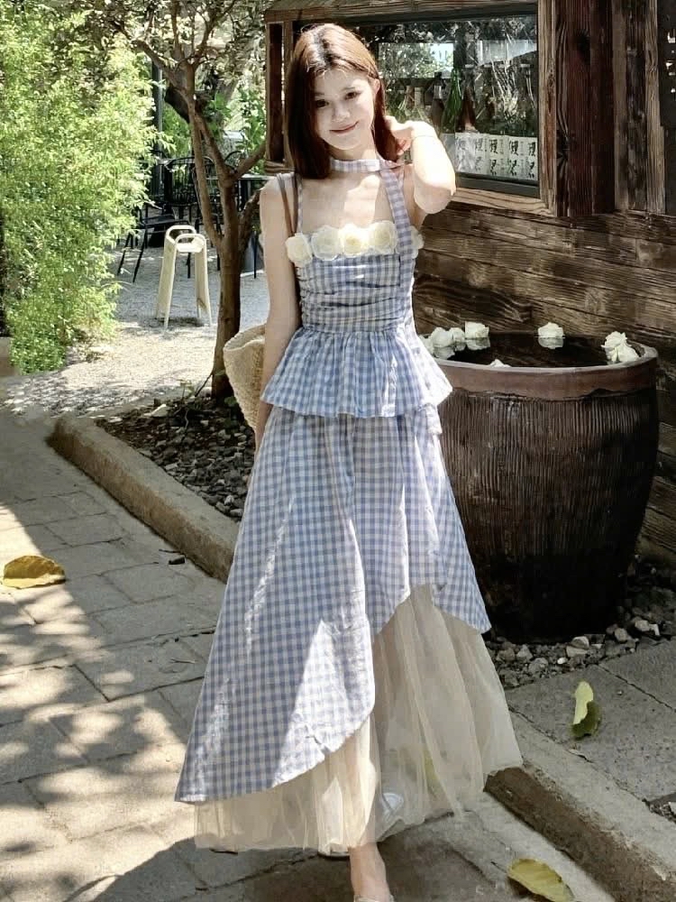格紋花卉貼花抹胸*不對稱格紋薄紗長裙两件套