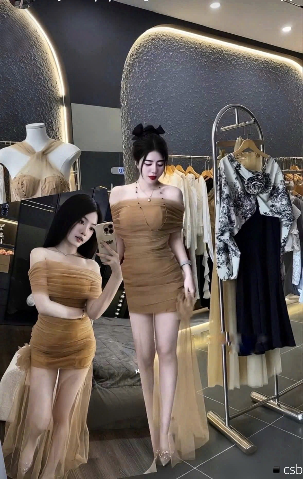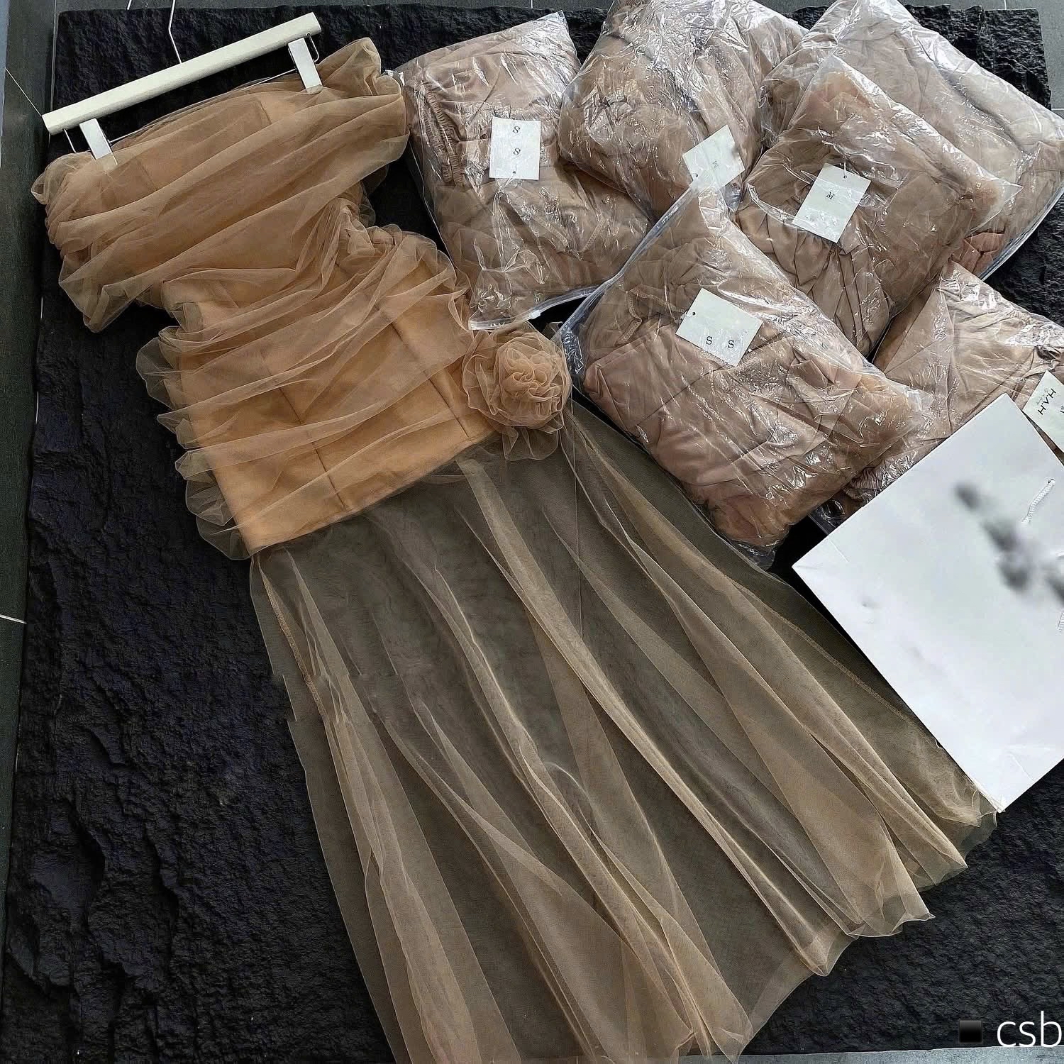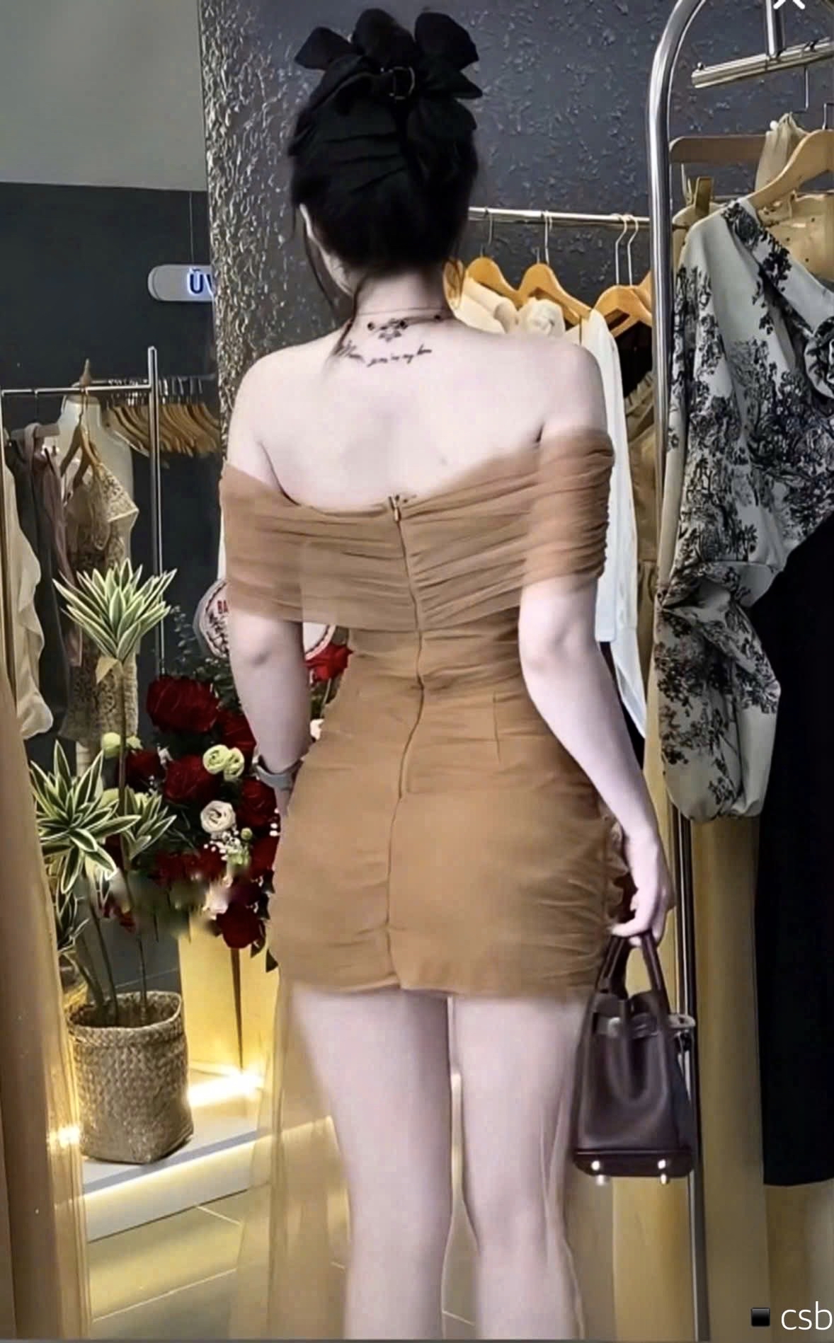 棕色露肩褶飾連身裙