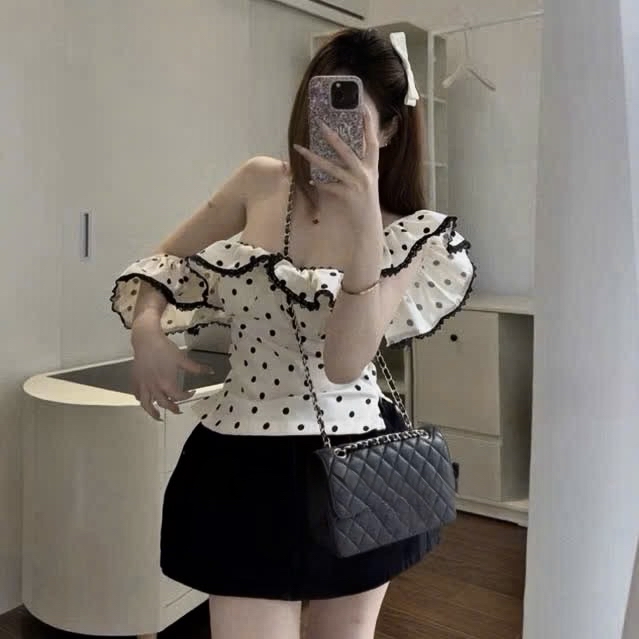 波爾卡圓點蕾絲邊上衣搭配黑色裙子两件套