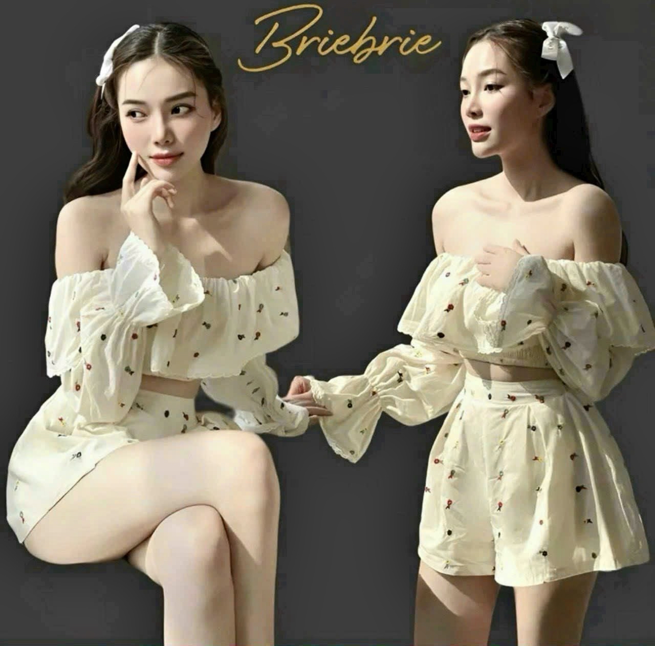 波西米亞花卉印花露肩短上衣搭配短褲套裝