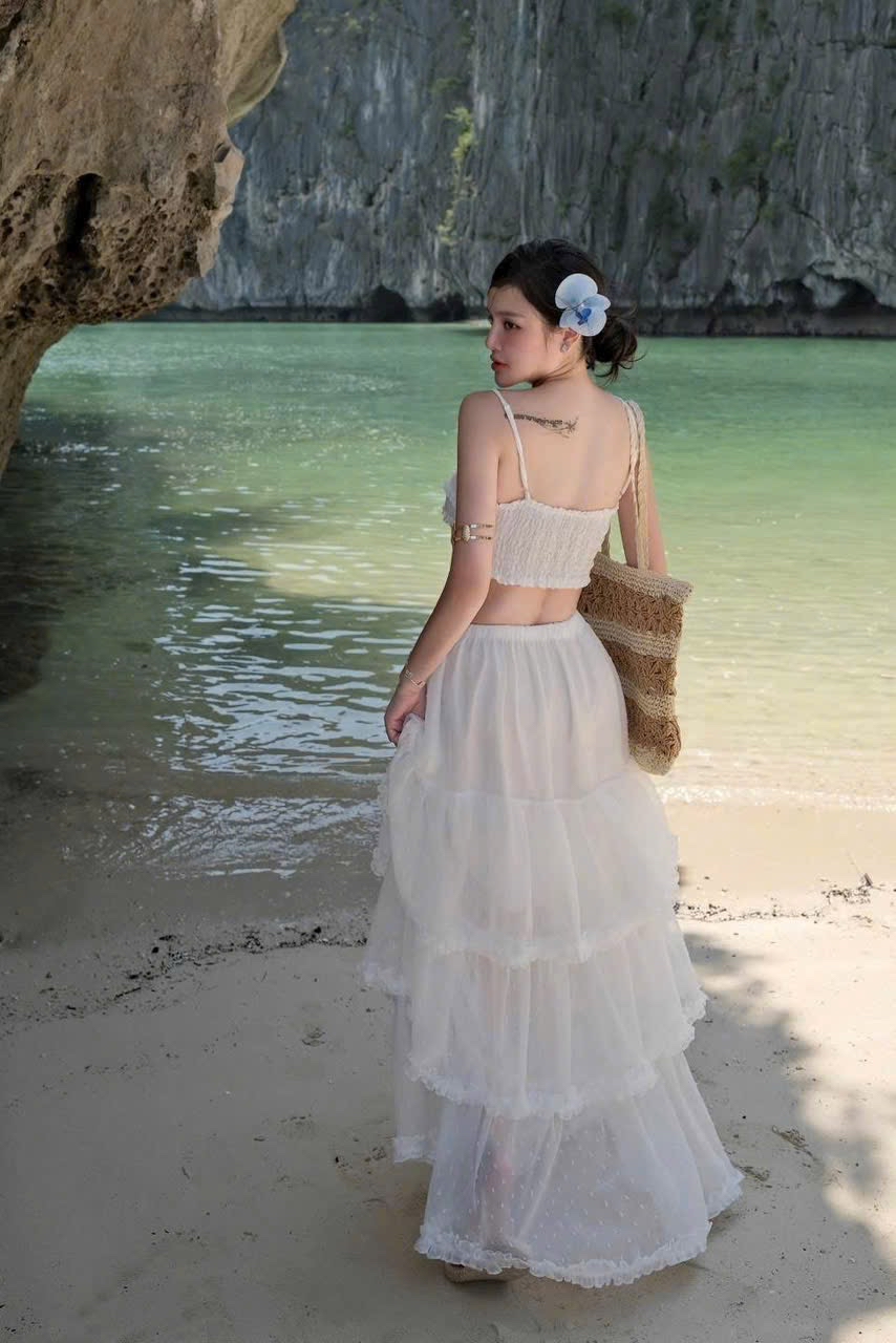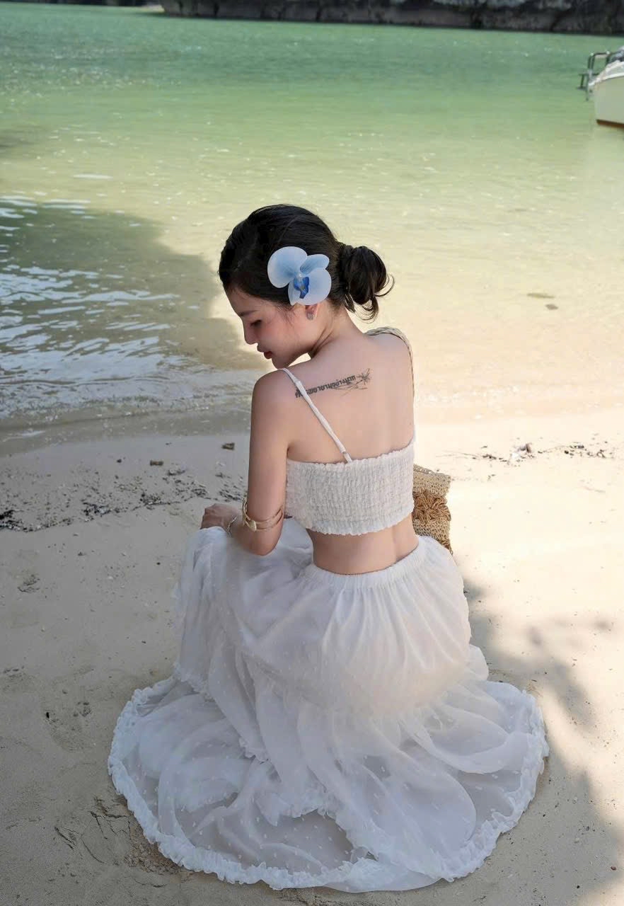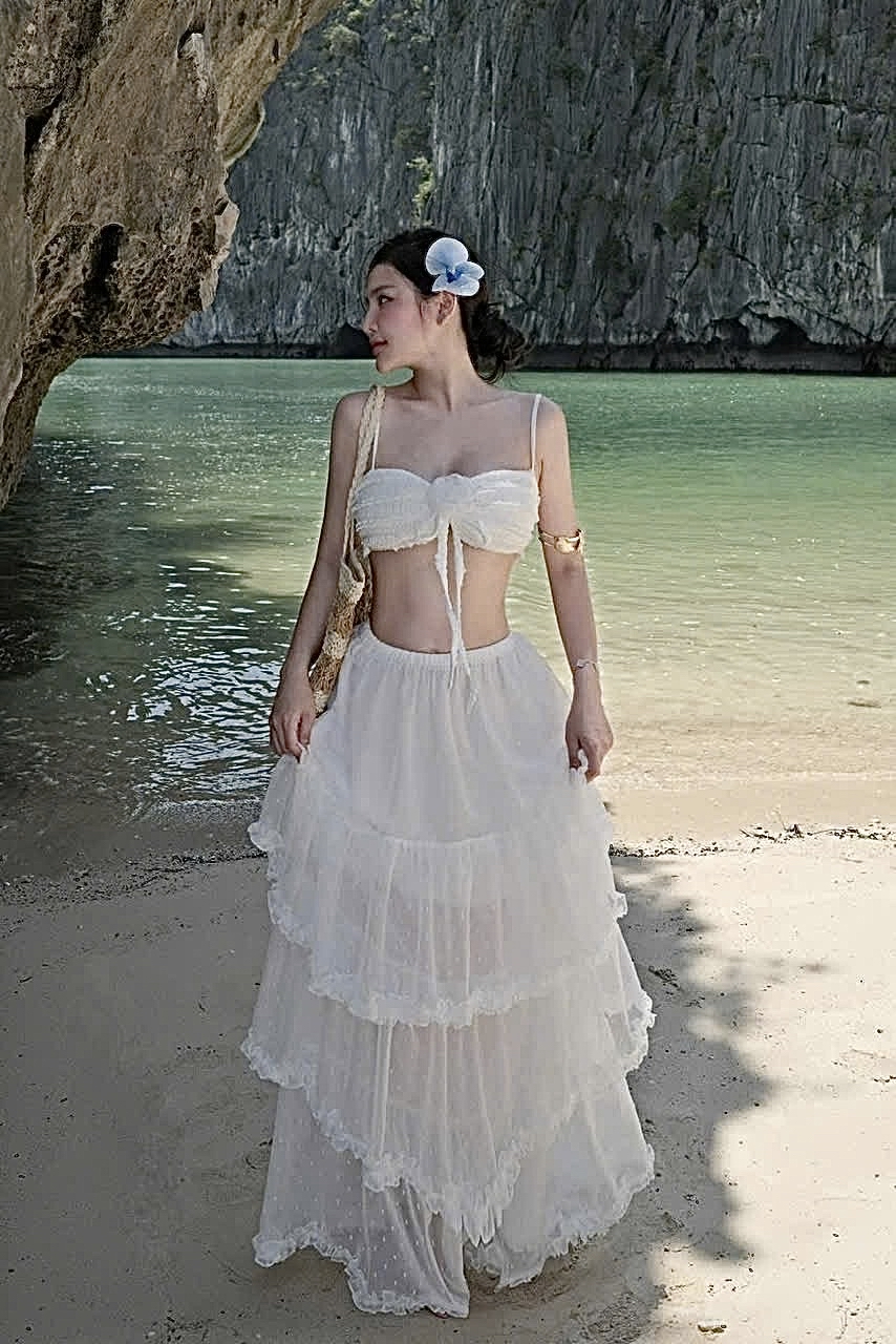 海灘上穿著白色連身裙的優雅女人