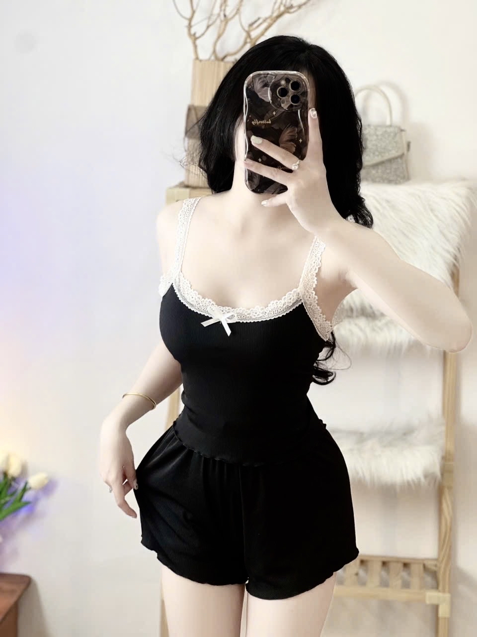 灰色針織吊帶背心/短褲套裝,搭配蕾絲邊