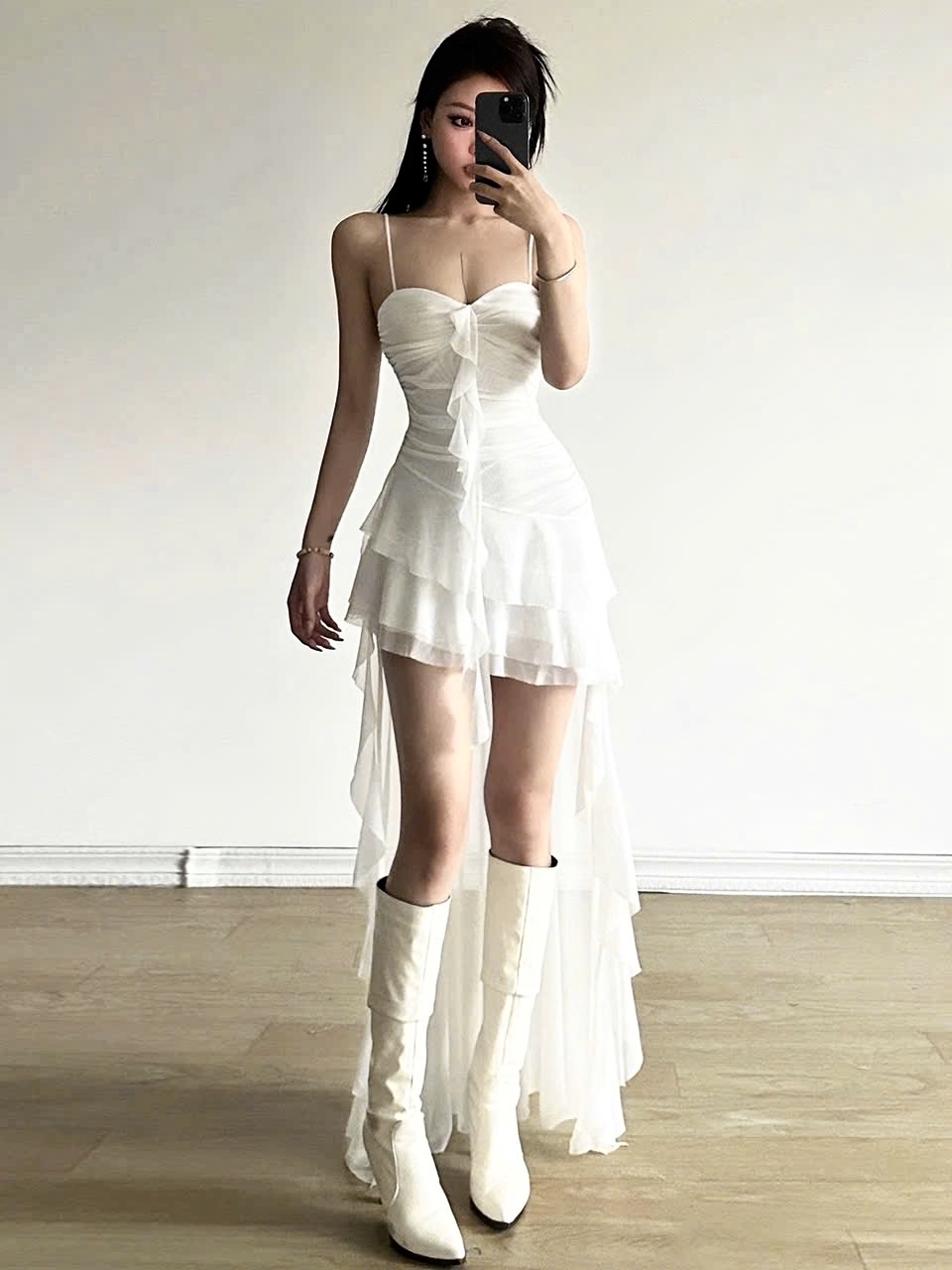 白色荷葉邊高低洋裝