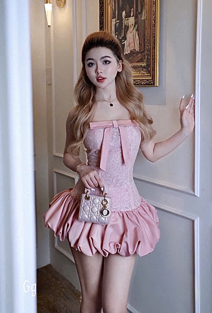 粉紅色蕾絲蝴蝶結迷你連身裙