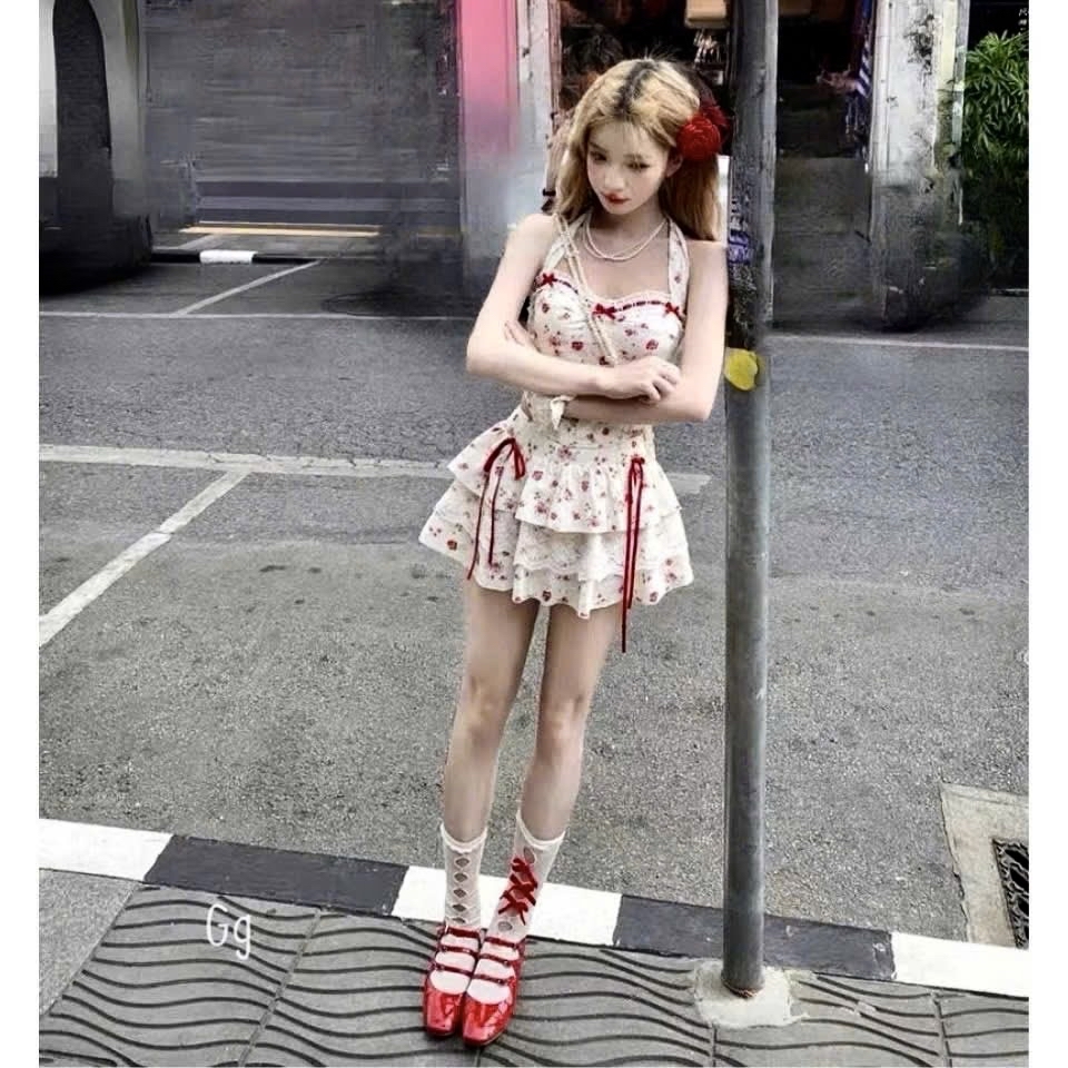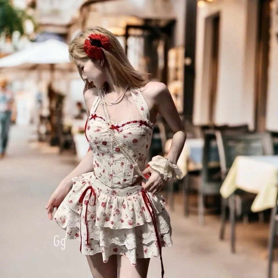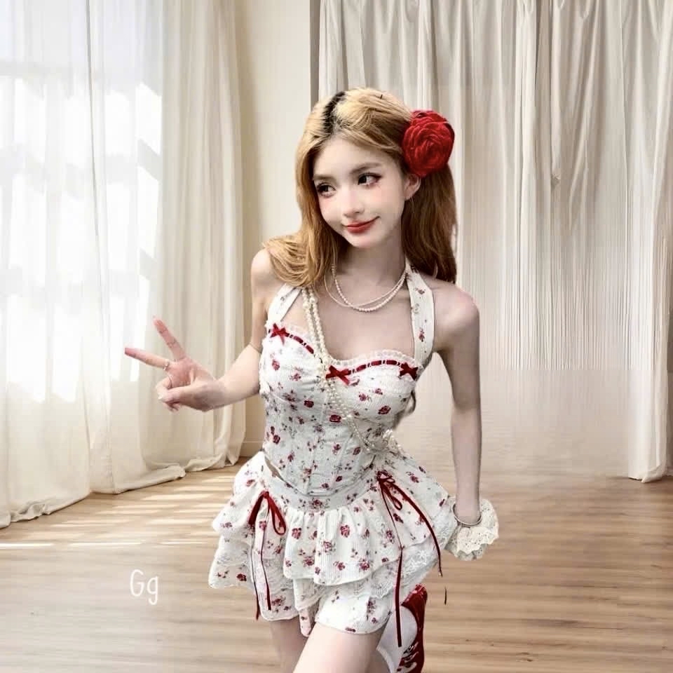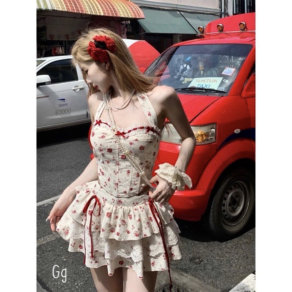 花卉束身胸衣吊帶上衣搭配荷葉邊層疊迷你裙两件套裝