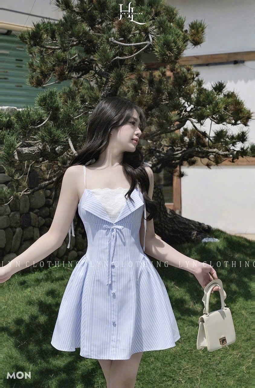 蕾絲條紋迷你太陽裙* 藍白條紋A字裙