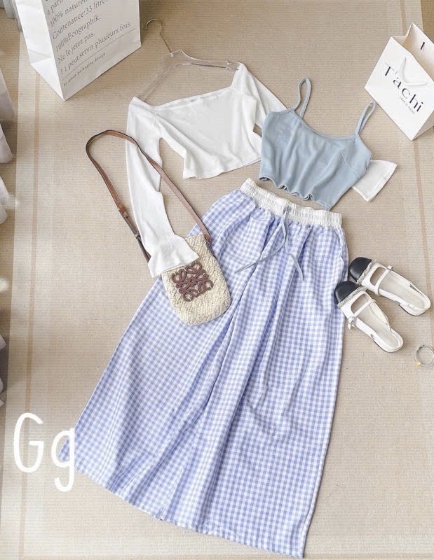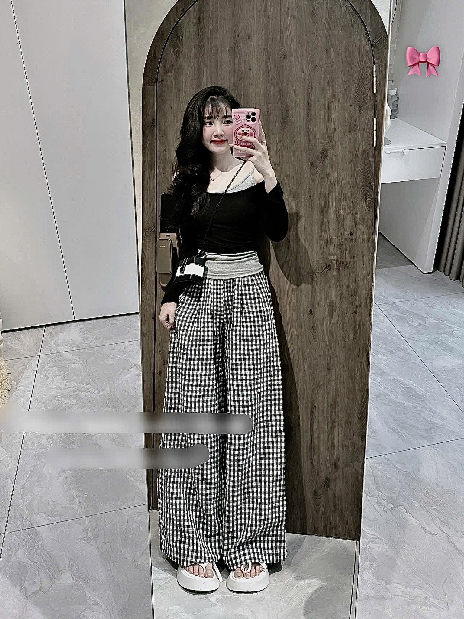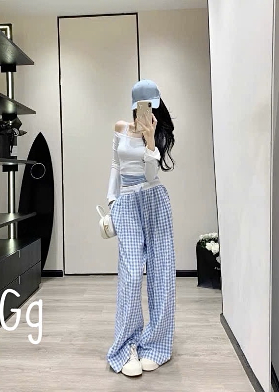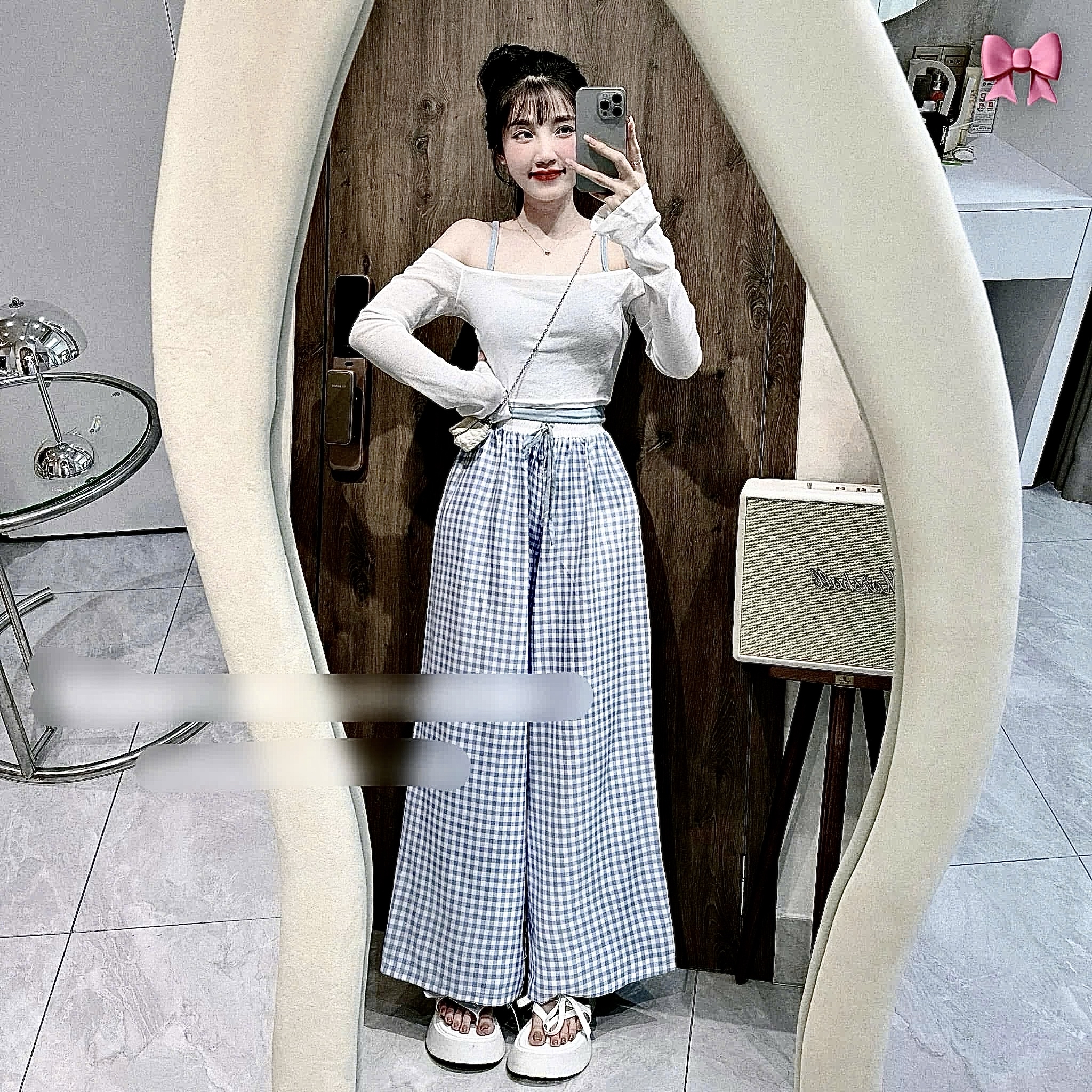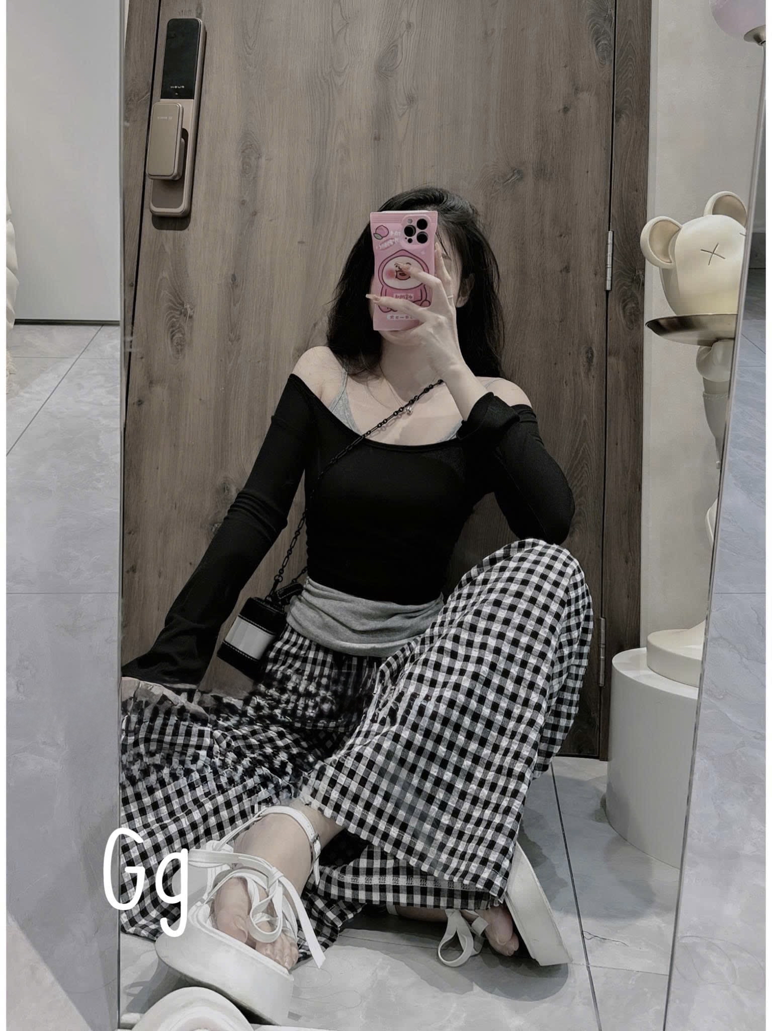 长袖上衣搭配小背心+休閒格紋褲三件套