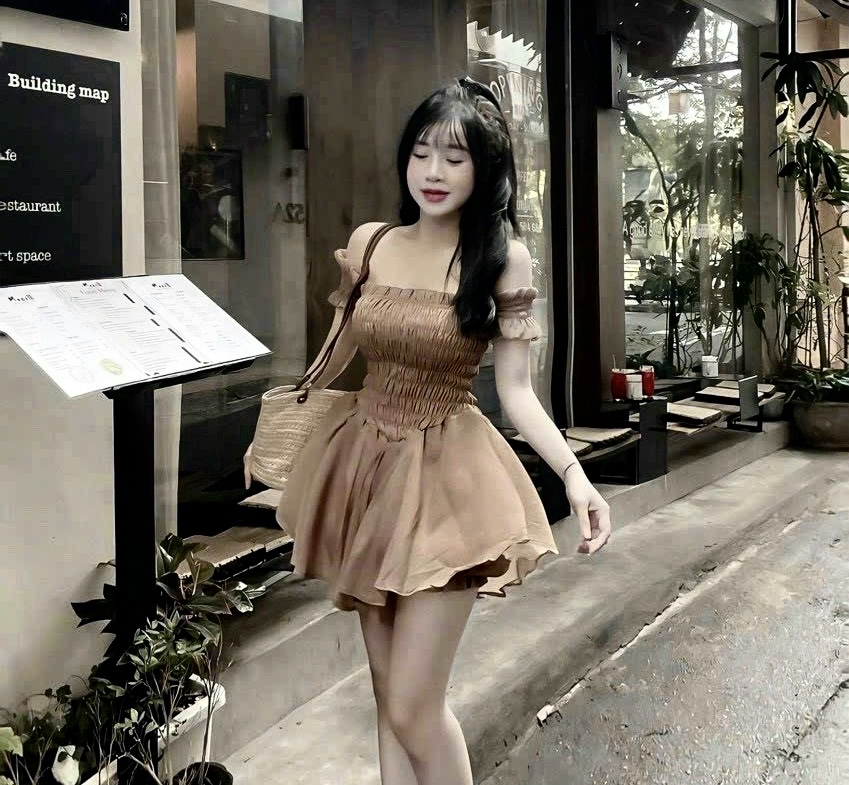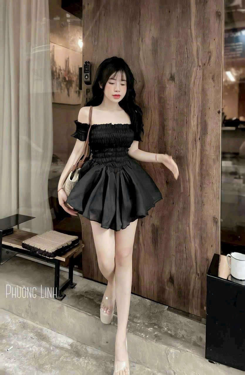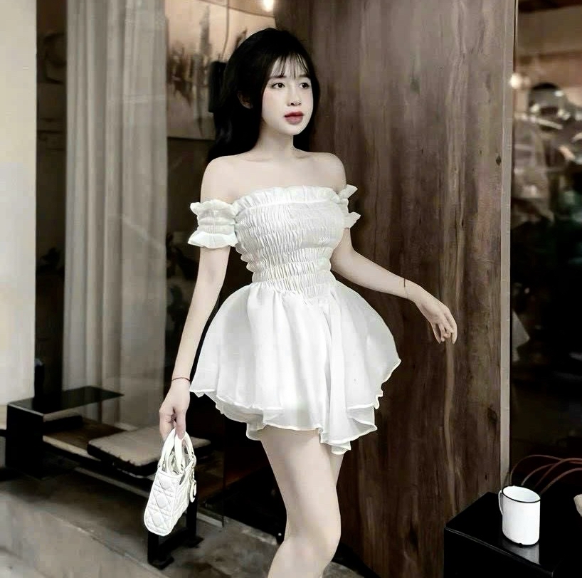 露肩褶飾荷葉邊洋裝