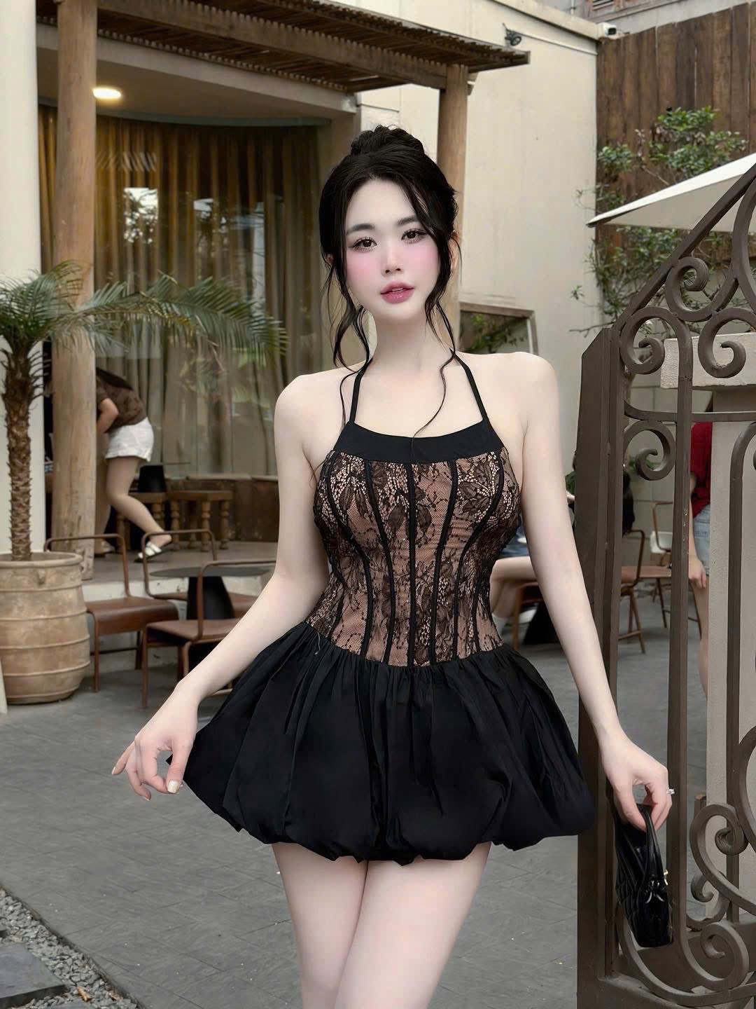 黑色蕾絲束身吊帶迷你泡泡裙 * 優雅
